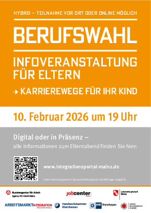 - Netzwerk Arbeitsmarkt & Integration, Stadthaus Große Bleiche, Große Bleiche 46, 55116 Mainz Im Foyer findet der Elternabend auf Deutsch statt, im Raum 5056 auch auf Ukrainisch und im Raum 211 auf Englisch.